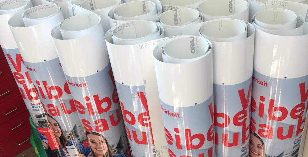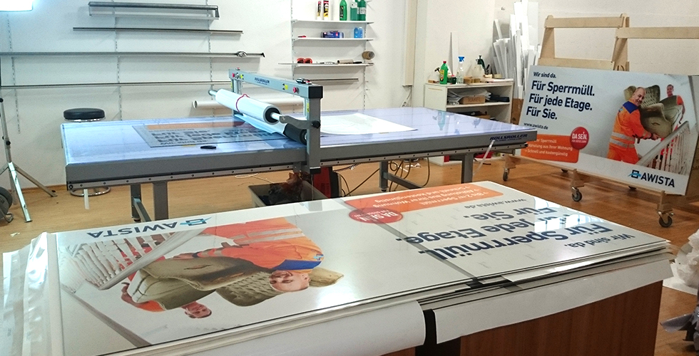 Knappe Timings, schlechte Vorlagen und langes Warten auf Kundenfreigaben können uns nicht mehr aus der Ruhe bringen. Durch unseren ständig optimierten Workflow haben wir bisher jede Situation gemeistert. Vom Deckenbanner, 3D-Logo, Folienschnitt, Wandabwicklungen bis hin zu großflächigen Bodengrafiken - wir finden immer eine individuelle, passende, budgettreue Lösung für Sie.